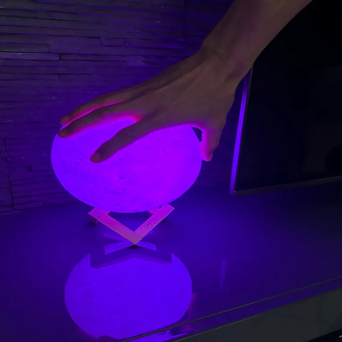 Image principale : lampe-lune-3d-decorative-luno.webp – Lampe LUNO LED 16 couleurs : forme sphérique imitation lune, éclairage violet tactile activé, main posée sur la surface texturée 3D, socle en bois triangulaire clair, ambiance nocturne apaisante avec reflet miroir sur support brillant.