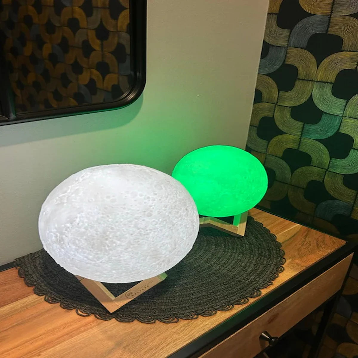Illuminez deux pièces d’un coup avec ce lot de lampes lune 3D rechargeables. Chaque globe en impression PLA reproduit fidèlement les cratères lunaires, posé sur un socle en bois naturel pour une touche déco chaleureuse. Avec 16 couleurs, un contrôle tactile (et/ou télécommande selon modèle) et une batterie USB offrant jusqu’à 10 h d’autonomie, ce duo crée une atmosphère cosy au salon comme dans la chambre. À associer avec notre Projecteur Galaxy Aurora pour une immersion céleste.